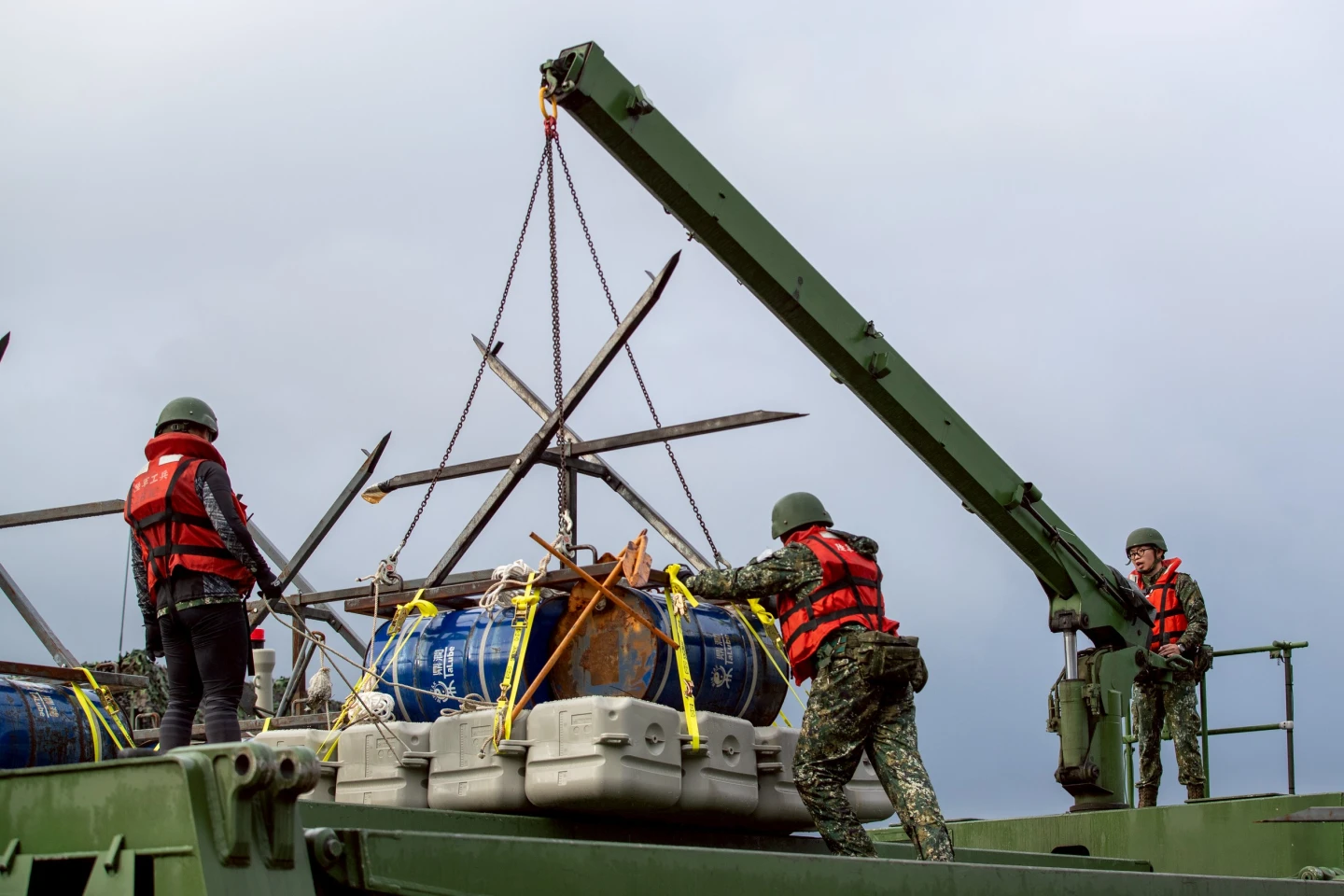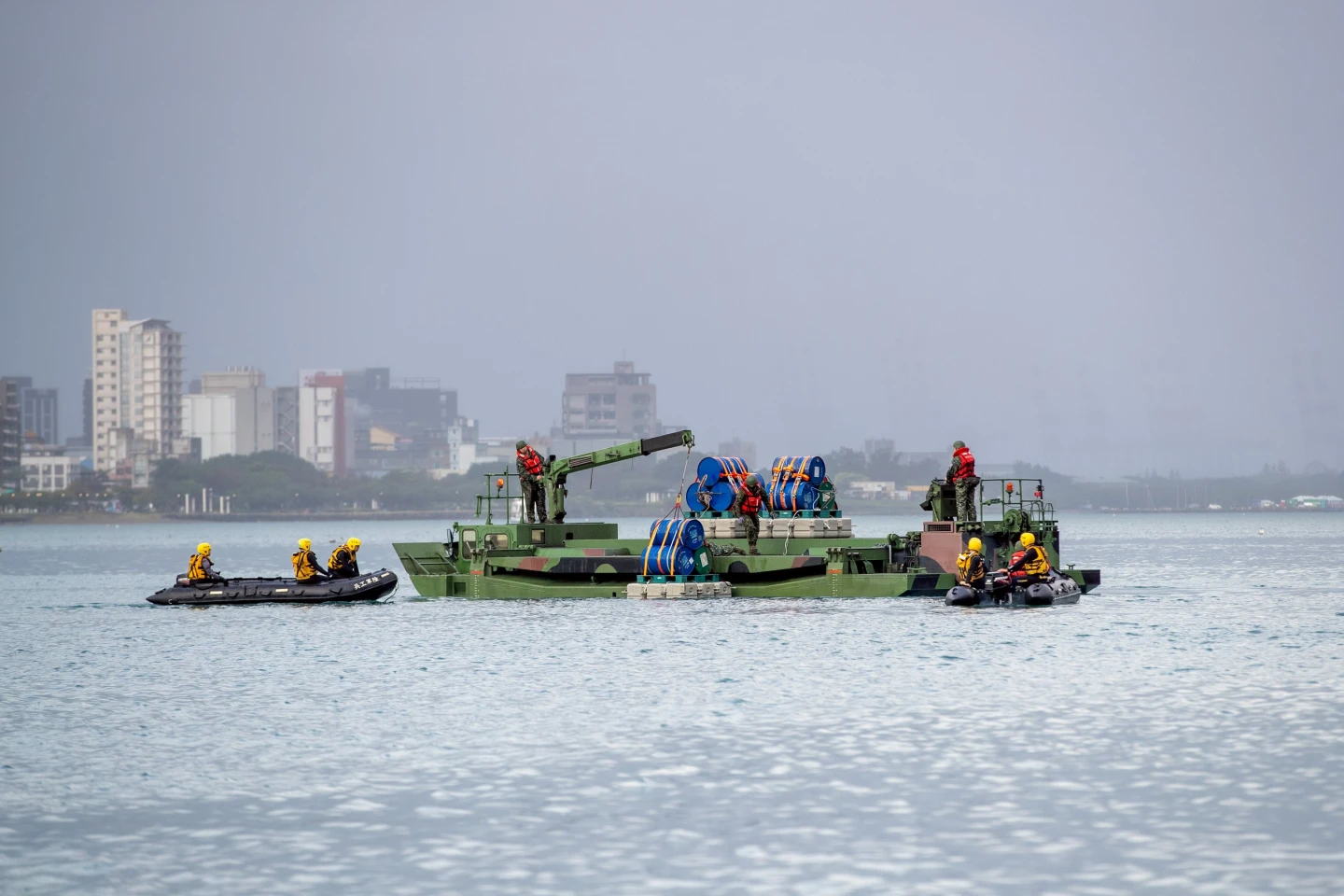 第三作戰區指出,河道阻絕設置以油桶爆破與浮動平臺裝載為主,透過浮門橋車完成阻絕設施吊掛與定位,並由偵察突擊舟負責後續解構與支援任務;演練過程中,岸邊指揮人員與水上作業人員全程保持通聯,掌握阻絕位置與間距,確保阻絕設施設置效果。