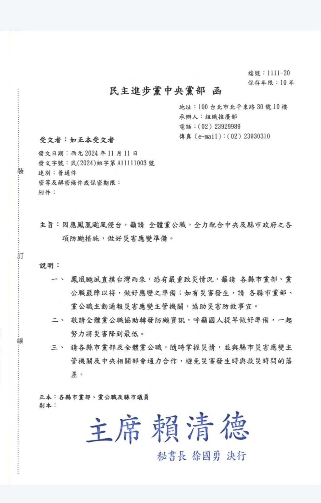 此外,賴要求黨公職協助轉發防颱資訊,呼籲國人提早做好準備,一起將災害降到最低,同時隨時掌握災情,並與縣市災害應變主管機關及中央相關部會通力合作,避免災害發生時與救災時間的落差。