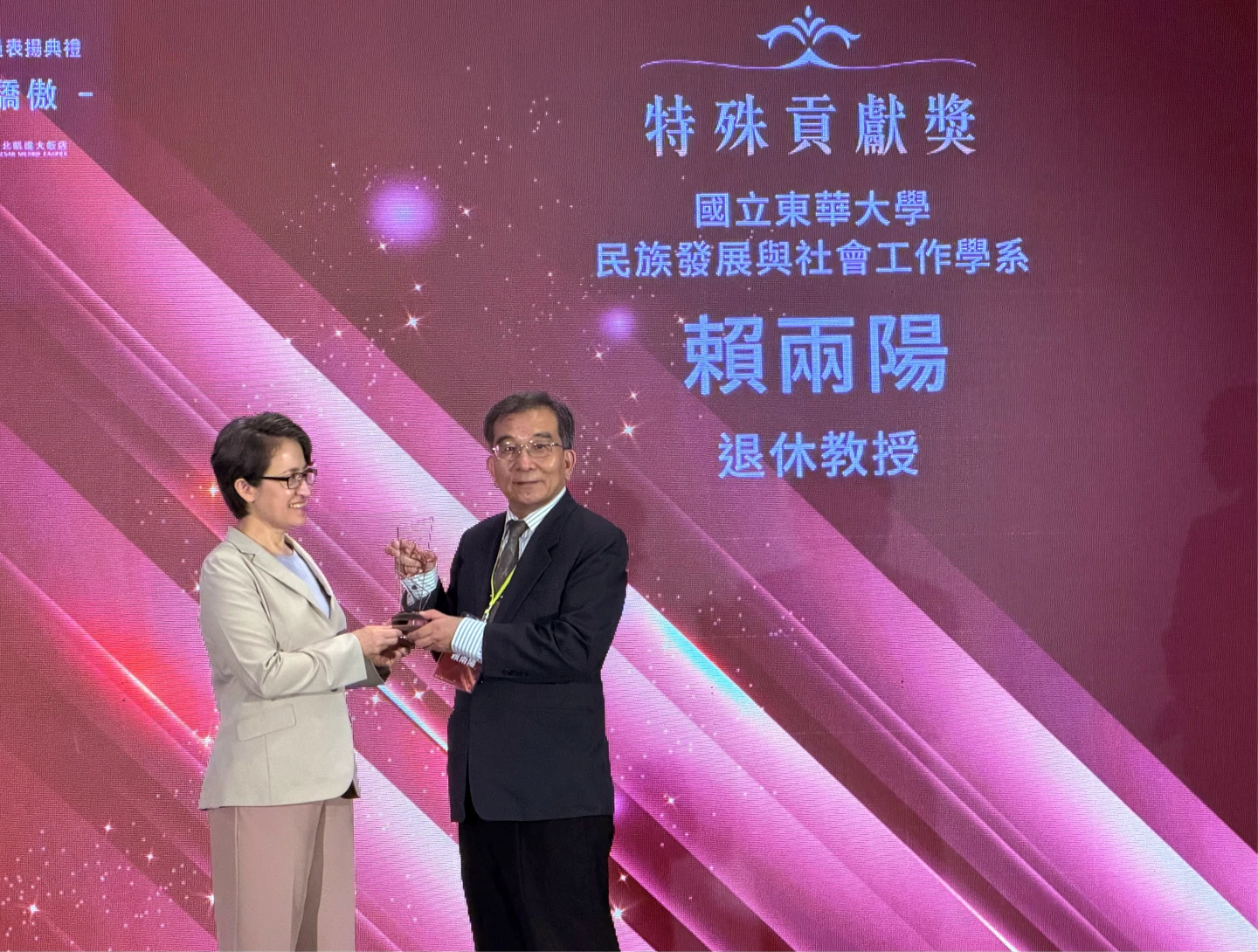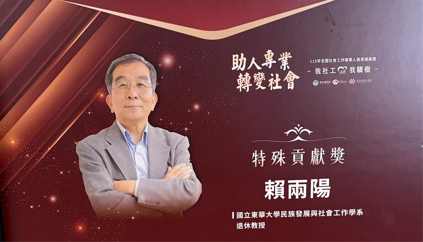 今年度的特殊貢獻獎得主,是國立東華大學民族發展與社會工作學系退休教授賴兩陽。他的職涯從第一線社工員,到社政與社工教學及研究長達40年,包含在東吳大學、國立東華大學共26年教職。