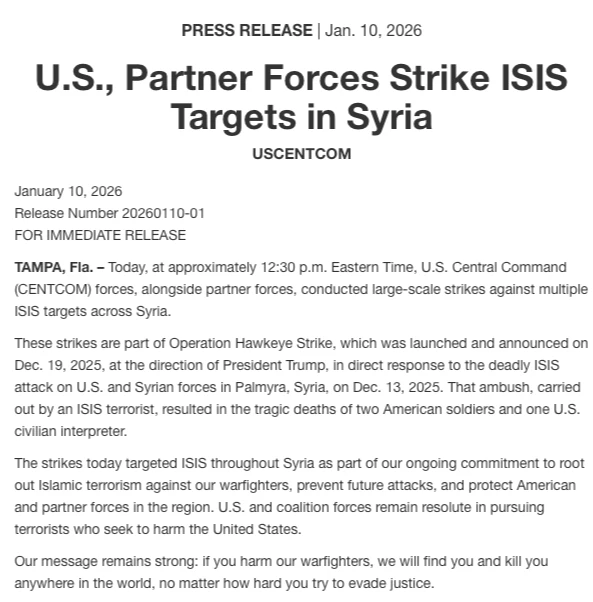 美軍中央司令部透過社群平台X發布聲明強調,「今天的空鎖定敘利亞全境的伊斯蘭國」,且為「鷹眼打擊行動」(Operation Hawkeye Strike)的一環,對於傷害美方作戰人員的行為絕不寬貸,並向敵對勢力發出強烈訊息:「無論對方藏身世界何處、如何企圖逃避審判,我們都會找到你並將你殲滅」。