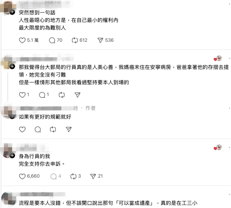 但也有人認為,男行員是堅守規定防詐阻,避免衍生法律訴訟爭端,「變遺產」之說也有疑慮。取自社群Threads