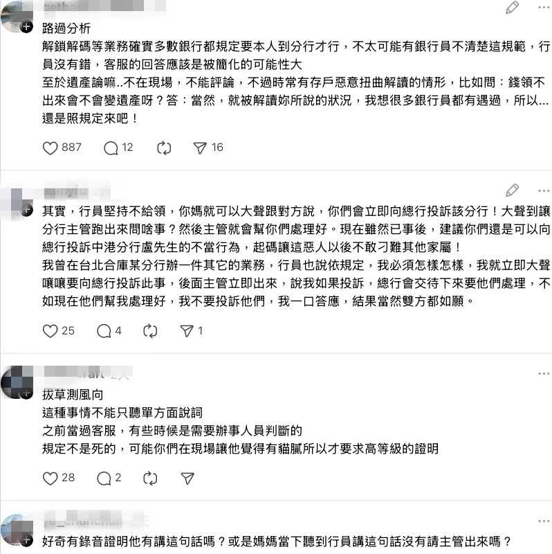 不過也有網友從制度面分析,強調銀行必須盡到「善良管理人」責任,解鎖久未使用的帳戶涉及資產安全,若未經本人確認就放行,一旦存戶康復後提告,或發生家族爭產與盜領糾紛,銀行與行員將面臨法律責任,因此堅持「本人到場」是為了保護存戶資產與防詐。還有人推測「變遺產」爭議言論,可能是行員解釋法律上的繼承程序,卻被焦急的家屬誤解為惡意詛咒,且在缺乏錄音檔的情況下,單方說法可能有所偏頗。