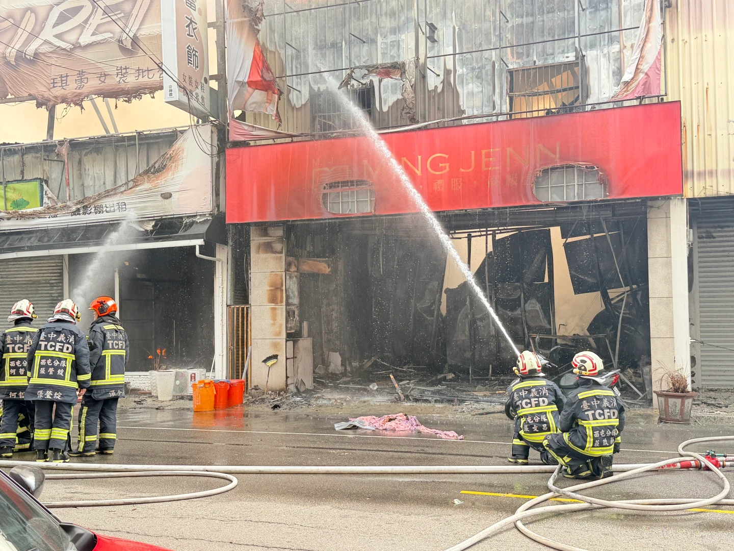 由於火勢迅速往周邊延燒,波及崇德路上美髮店、天津路上服飾店及倉庫,火舌甚至朝向緊鄰的中油加油站,消防人員立即在加油站周邊設置防火牆,同時也在四周佈署水線全力灌救,全力防堵火勢延燒。