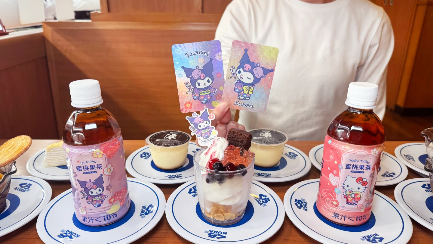 餐點方面,藏壽司攜手三麗鷗家族首度推出「酷洛米濃醇巧克力布朗尼莓莓果凍聖代 180元」以紫色酷洛米為主軸,將牛奶霜淇淋、玉米脆片、布朗尼與莓果果凍層層堆疊淋上藍莓醬,最後放上酷洛米穿上日式和服的插卡,購買聖代還可獲得「Sanrio characters盲袋閃卡」,限量2萬份;同步推出「蜜桃果茶80元」則有Hello Kitty與酷洛米2款限定包裝,12月26日起限時開賣。