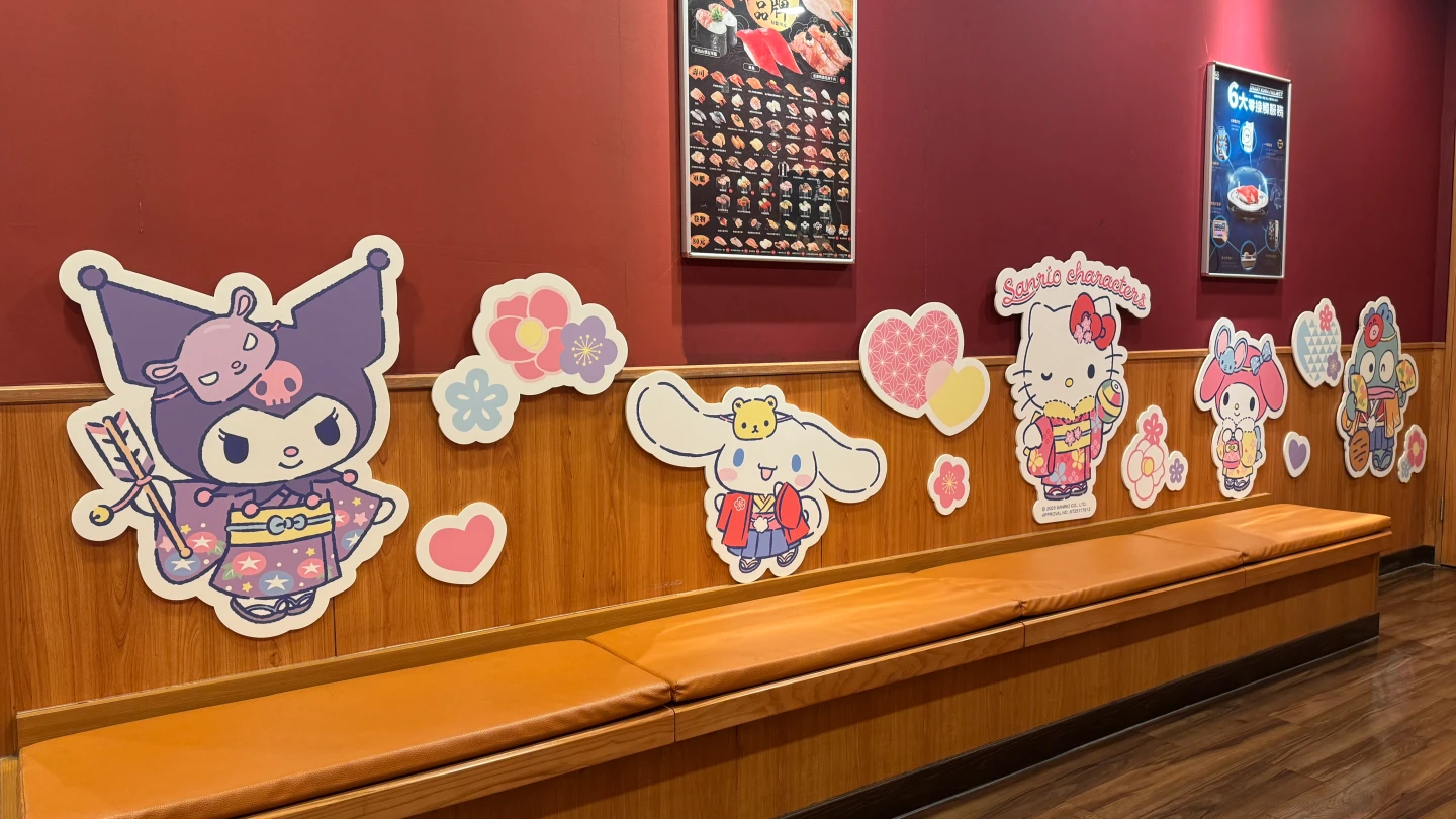 台灣藏壽司精選「桃園大興西店」、「高雄五福光華店」、「板橋遠科店」、「台北館前店」及「台中惠文路店」打造三麗鷗家族限定佈置門市,其中「桃園大興西店」及「高雄五福光華店」全新登場,從迎賓大門、等候區到入座的座席都換上三麗鷗家族主題設計。