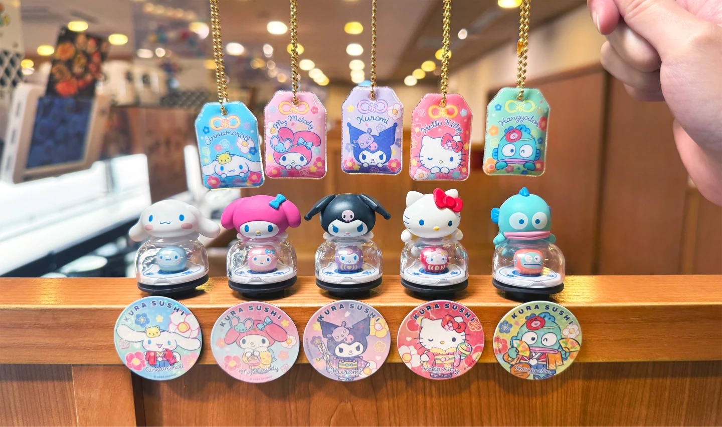 台灣藏壽司X三麗鷗12月26日起以「好運祈福」為核心推出全新15款限定扭蛋,首推5款「鮮度君吊飾」,三麗鷗家族角色趴在鮮度君上,內還蘊藏各式達摩,紅色Hello Kitty象徵開運招福、藍色大耳狗喜拿象徵考運亨通、橘色人魚漢頓和紫色酷洛米象徵事業順利與長壽安康、粉色美樂蒂則是幸福美滿,每款代表不同的寓意。