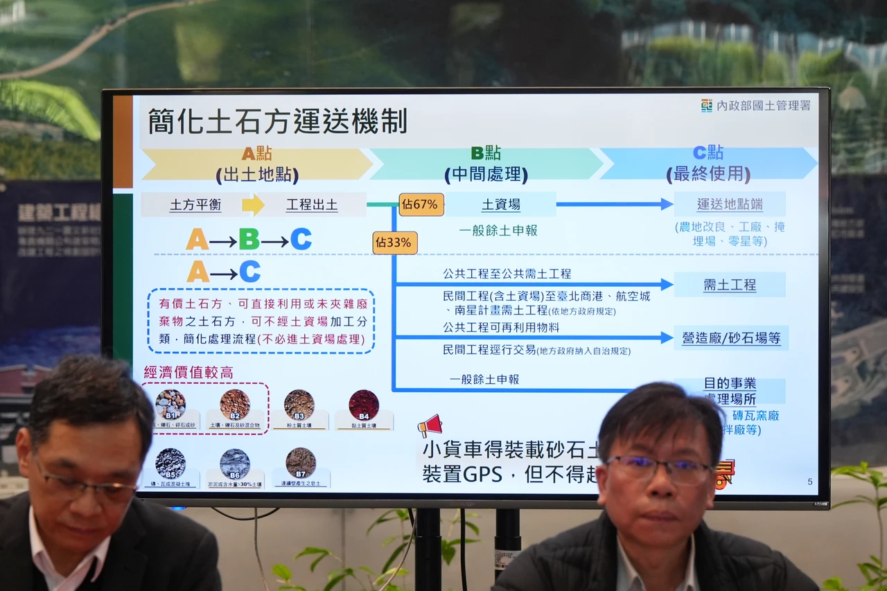 【記者羅元駿/台北報導】內政部元旦起實施的「全流向管理」新制,讓土石方話題不斷。國土署今天提出「提供去處與簡化程序」2項4作為,其中若為有價、可直接利用或沒有夾雜廢棄物的土石方,經地方政府相關條例規則,就可以直接從出土地點運送最終使用地。官員也強調,盼土資場可善盡篩分責任,政府也會努力開出最終處置場量能。