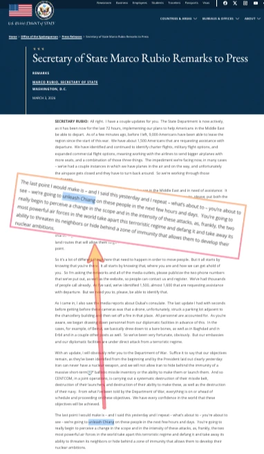 根據美國國務院官網發布的逐字新聞稿,也確實寫到盧比歐在談話中用到「讓蔣介石出場」這個詞。