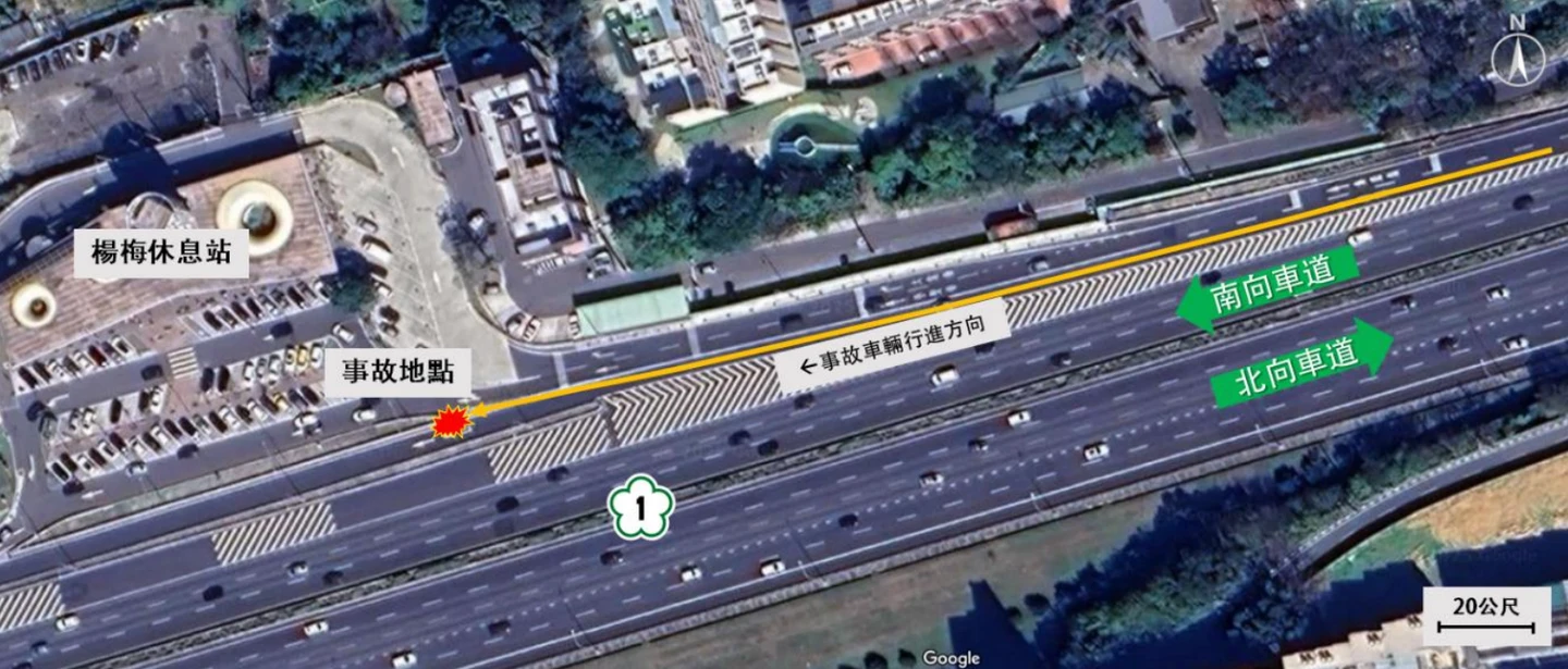 二、五楊高架段南向終點內外車道皆為直線車道,內側車道銜接穿越性匝道,外側車道直接銜接楊梅休息站入口匝道,駕駛人不容易察覺已進入匝道,另外,雖然路段有寫限速80公里、60公里,減速長度符合標準,但駕駛車速100公里,短時間內觀察密集出現的標誌、標線訊息,還需判斷後續行駛路線,在此多重且快速變化的情境下,可能增加駕駛人的認知負荷。