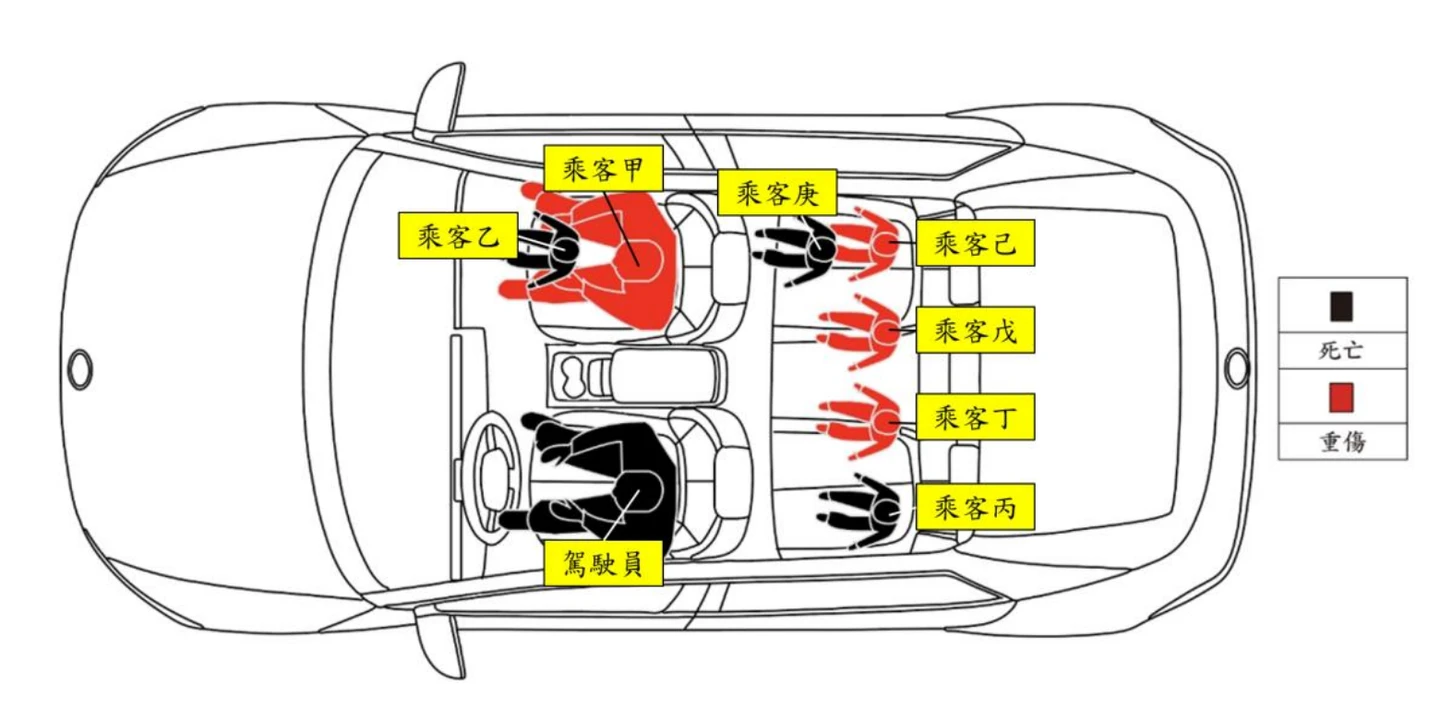 六、事故車輛超載,造成車內被動安全配備於車輛自撞時,即使在作動與使用下亦無法有效發揮保護乘員效果,且該車輛使用時未依規定配置安全椅,可能降低車內幼童乘員之保護及生還機率。