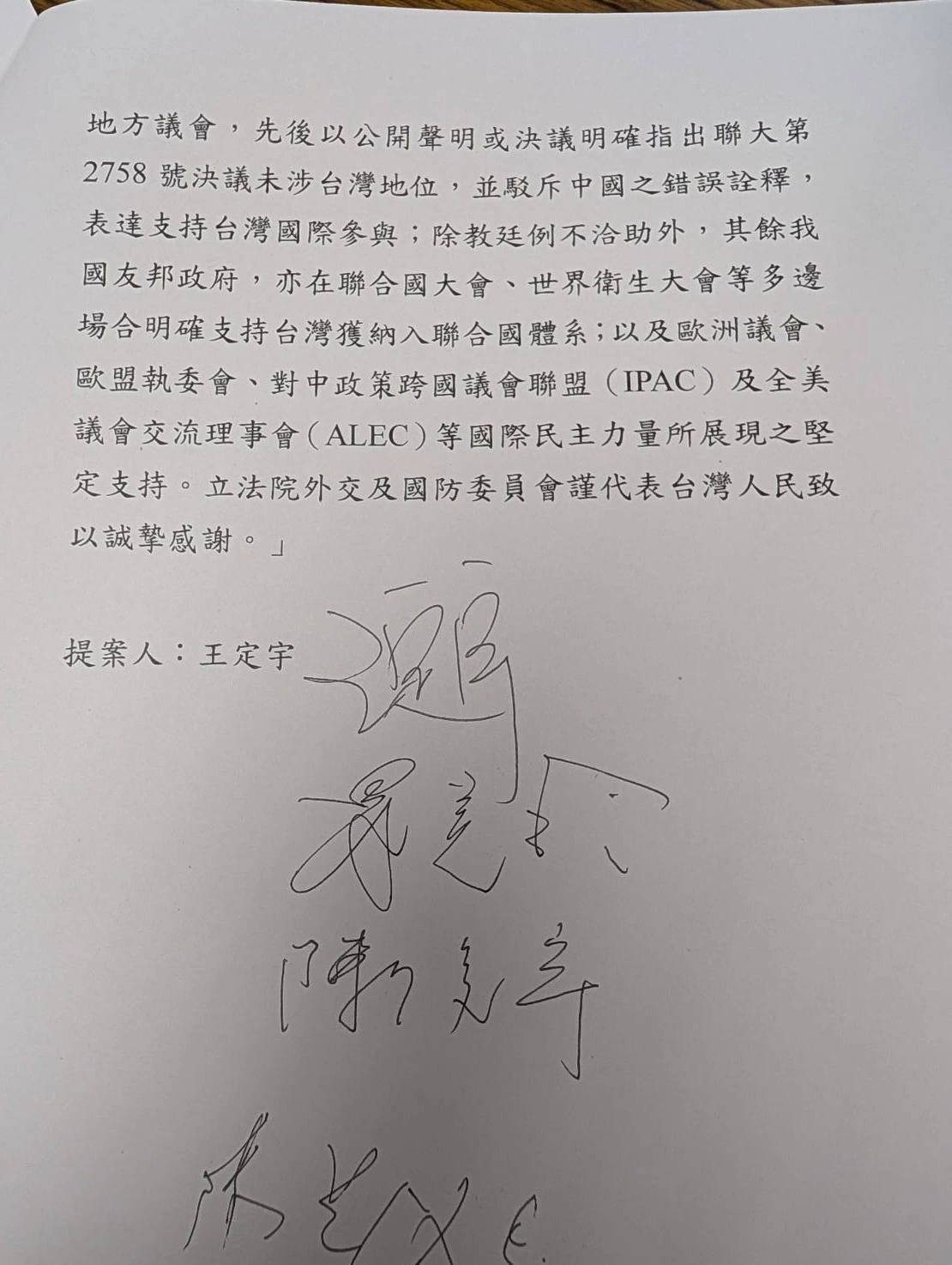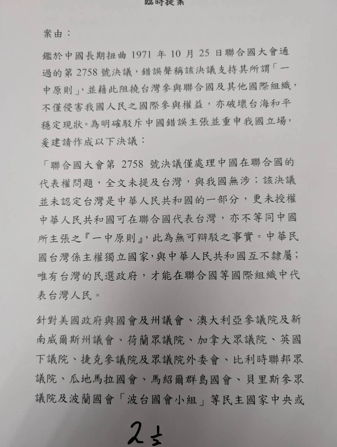 另件提案針對中國長期扭曲1971年10月25日聯合國大會通過的第2758號決議,錯誤聲稱該決議支持「一中原則」,阻撓台灣參與聯合國及其他國際組織。