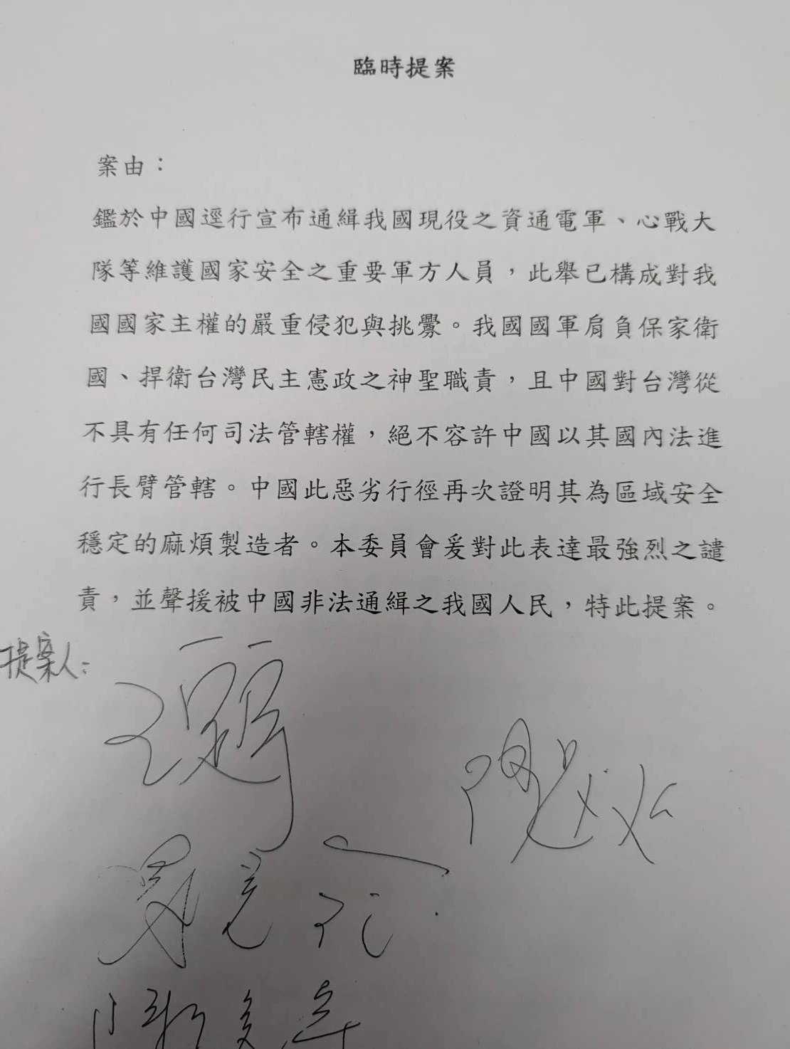 王定宇、羅美玲、陳俊宇、陳冠廷等四位外交國防委員會綠委今提出2件臨時提案,首件有關中國逕行宣布通緝我國現役資通電軍、心戰大隊等維護國家安全之重要軍方人員,已構成對我國家主權的嚴重侵犯與挑釁。