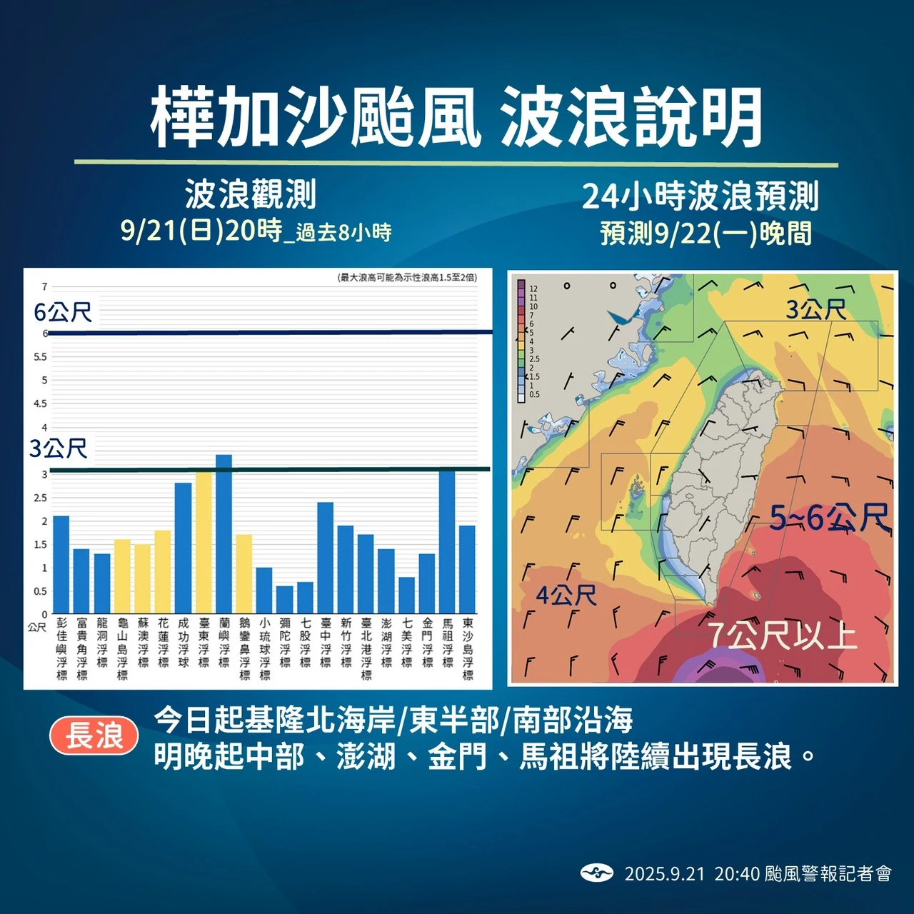 更深夜之後南部沿海,以及明晚起中部地區、澎湖、金門、馬祖,都可能會有長浪發生;明天晚上台灣各海面,基本上都會有3米以上浪高,尤其近颱風中心的蘭嶼、綠島、恆春半島等地,甚至可能達到7米以上浪高。