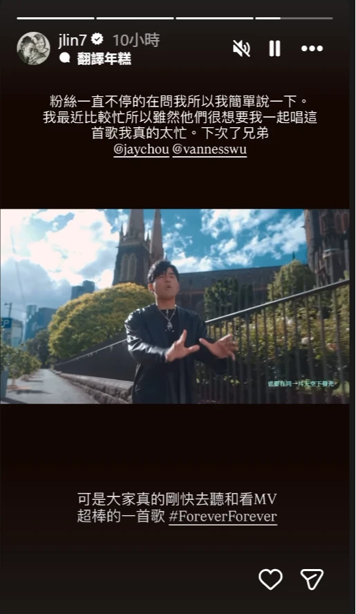 林書豪在社群分享《恆星不忘Forever Forever》MV,還寫道:「粉絲一直不停的在問我,所以我簡單說明一下。我最近比較忙,所以雖然他們要我一起唱這首歌,我真的太忙,下次了兄弟。可是大家真的趕快去聽和看MV,超棒的一首歌。」林書豪還tag周杰倫與吳建豪的帳號。