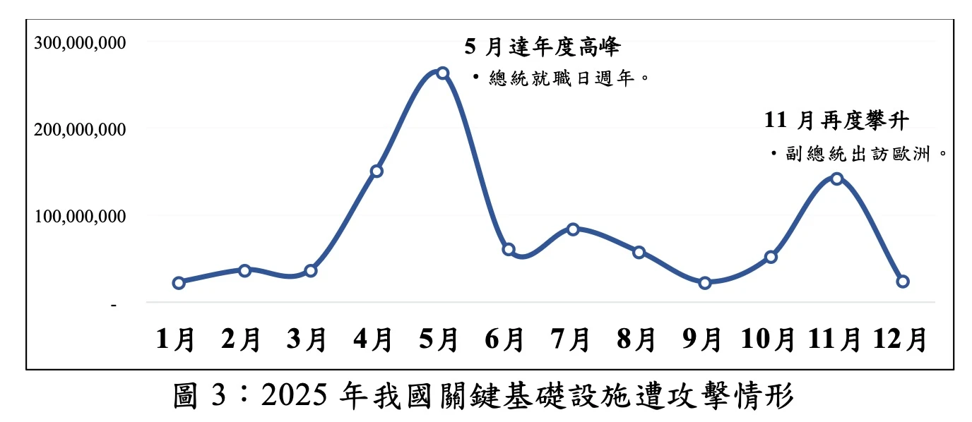 國安局指出,中共對我網駭具「政軍施壓」特點,去年相關網路侵擾活動,與解放軍對台「聯合戰備警巡」的時間點具一定程度關聯性;另,在我國重大慶典、政府高層發表重要談話或出訪時,中共亦會升高網路侵駭,尤在2025年5月總統就職週年期間達到年度高峰。