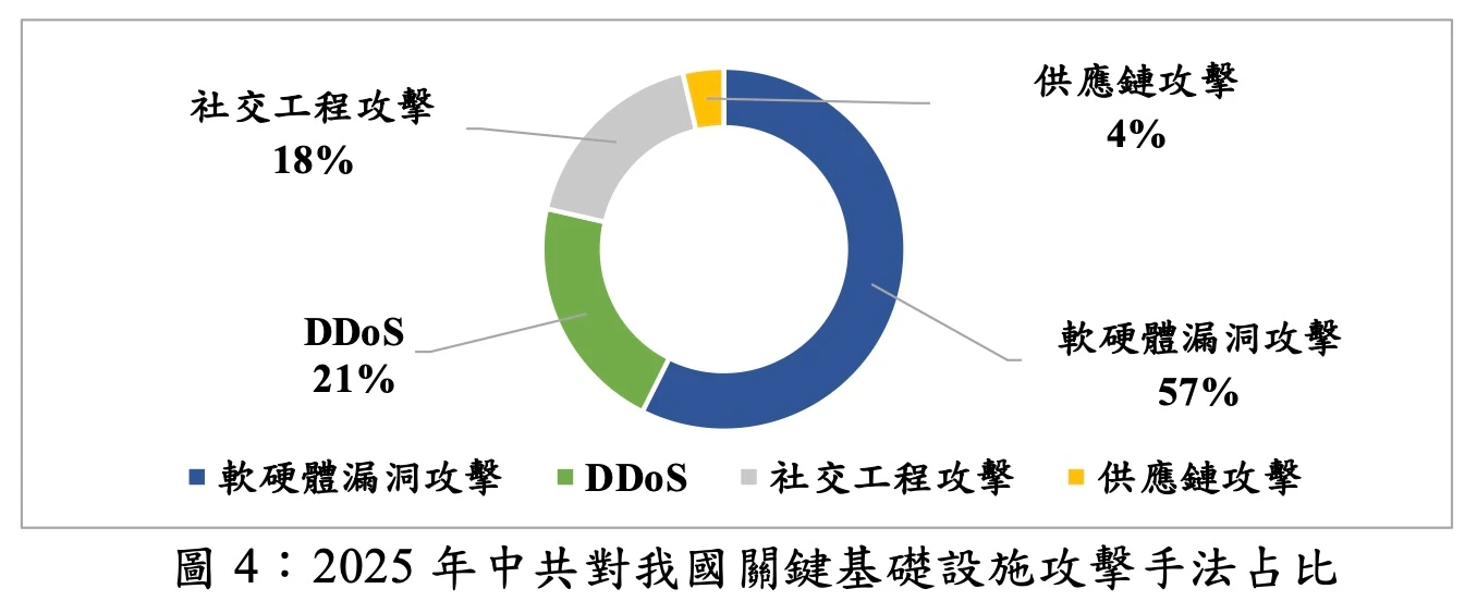 其中「軟硬體漏洞攻擊」手法使用占比超過5成,反映中共積極擴充「漏洞武器化」的技術能量,持續專研國際資通設備大廠或我政府共約採購之軟硬體漏洞,並鎖定未修補的關鍵基礎設施資通設備,藉以規避使用者身分登入驗證機制,進而取得設備管理權限駭侵竊資。