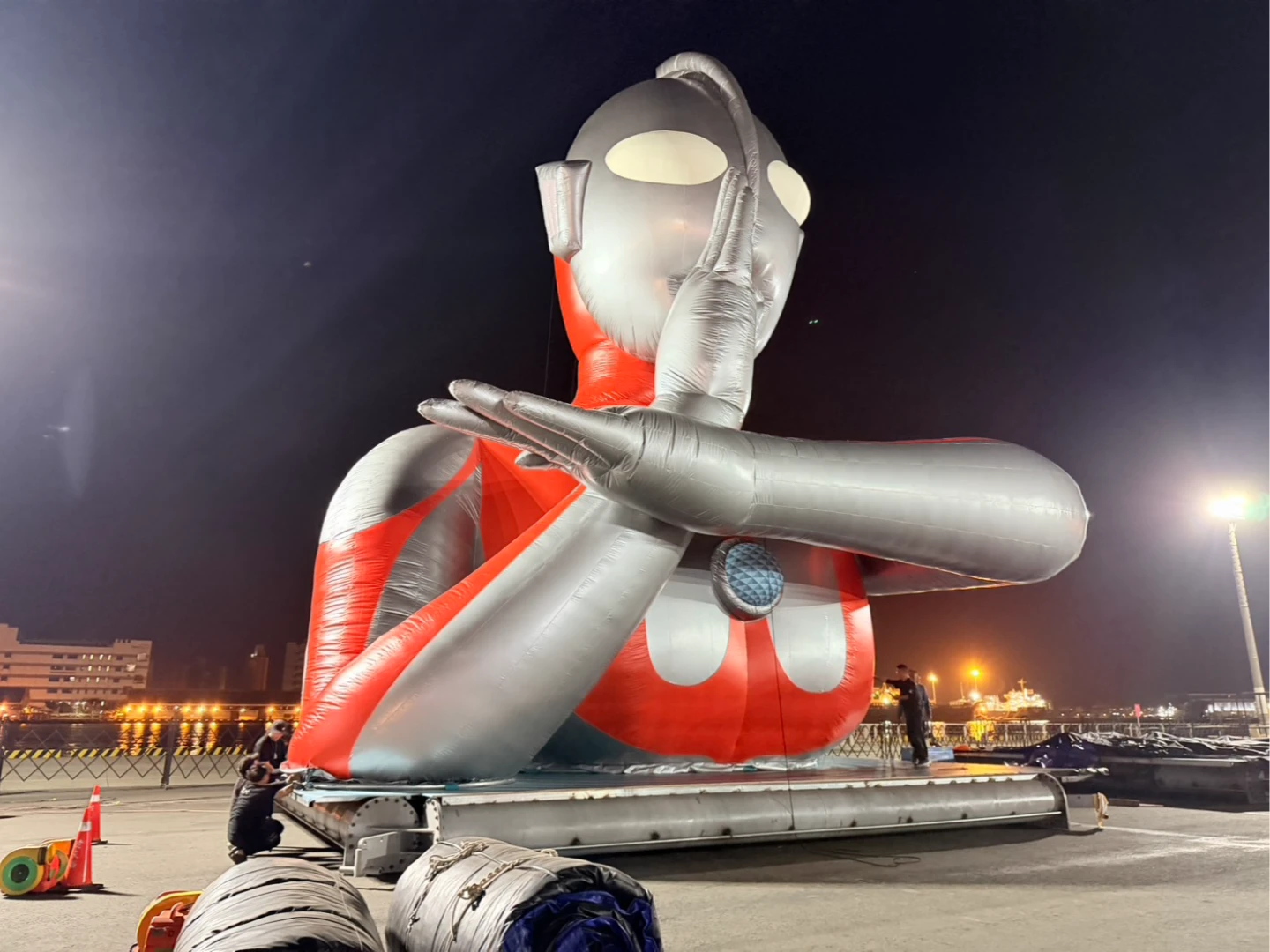 今年高雄冬日遊樂園打造兩座高達15公尺的巨大寫實版氣膜,其中「初代超人力霸王」經過充氣測試後,放在高雄流行音樂中心音浪塔前展出。民眾提供 zoomin
