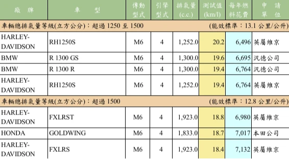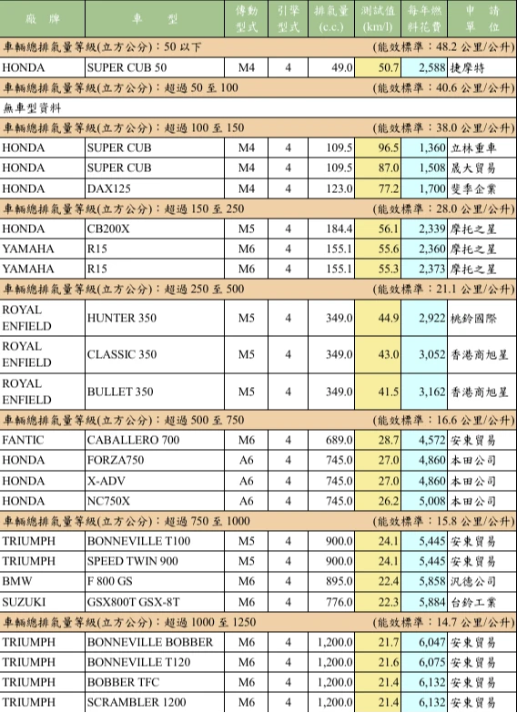 商用車類則為三陽(SYM)的TUCSON NX4H-C 1598c.c. A6 5D油電複合動力汽油商用車勝出,每公升汽油平均可行駛21.1公里。機車類則依據「機車燃料消耗量試驗方法」進行能源效率測試,立林重車有限公司代理的HONDA SUPER CUB 109.5c.c. M4表現最佳,每公升汽油平均可行駛96.5公里。