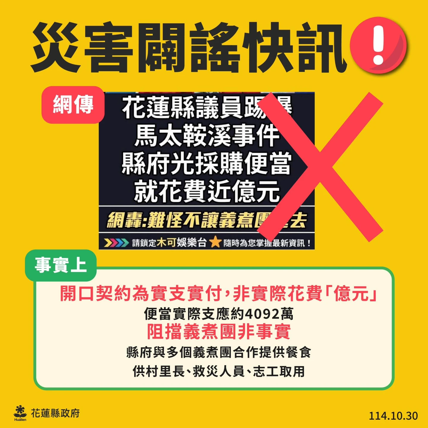 對此,花蓮縣政府晚間發布聲明澄清,採購金額都屬「開口契約」並非實際花費,依實際使用量實支實付,救災便當實際執行金額為4092萬元。