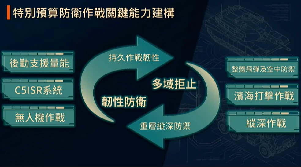 這個計畫將展現台灣多域聚集、韌性防衛能力,其中這一次特別預算有關的關鍵能力就是「多域拒止」。「多域拒止」就是要用不對稱的一個作戰思維,不管是從空中、海上、地面、網路、資電,甚至於到資訊,建立一個能夠重層的縱深防禦。