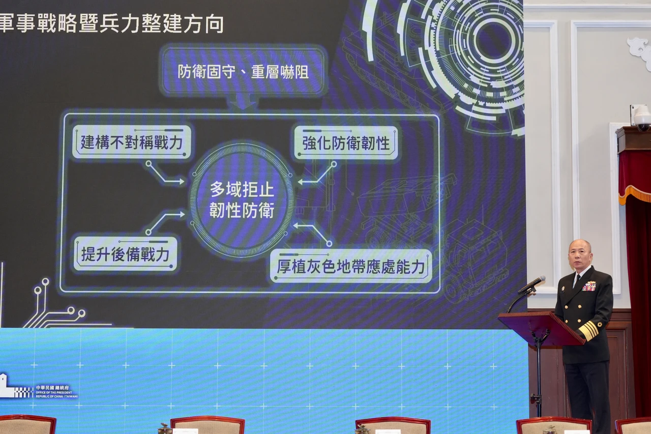 參謀總長梅家樹上將今在記者會中指出,國軍為因應中共不斷擴張的意圖和能力,依照總統和平四大支柱指引,秉持國防自主,以及發展不對稱戰力的國防理念,依據防衛固守、重層嚇阻的整體軍事戰略,發展四項重大建軍主軸,分別是建構不對稱戰力、強化防衛韌性、提升後備戰力、以及厚植灰色地帶的應處能力。