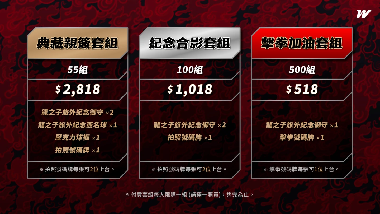 球團還推出限量的紀念套組,分別有「典藏親簽套組」、「紀念合影套組」和「擊拳加油套組」,球迷只要購買套組就可與徐若熙近距離簽名、合影或擊拳,相關的開賣訊息請見味全龍臉書粉絲團。