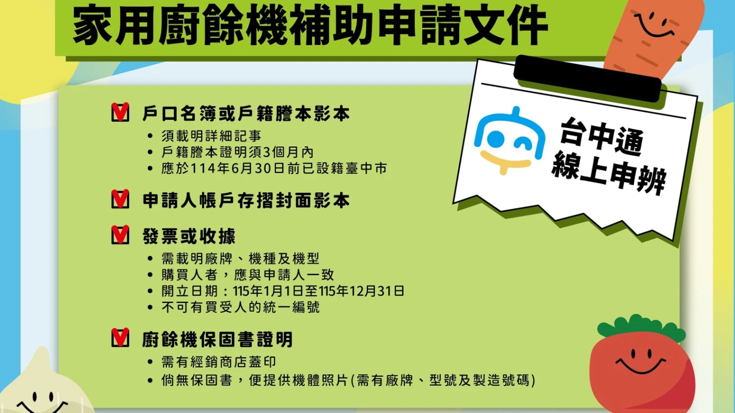 經發局提醒,凡設籍台中市且符合資格的市民,自2026年1月2日起皆可透過「台中通」APP或網頁版線上申請補助,呼籲民眾養成「瀝水再丟、吃多少煮多少」的良好生活習慣,攜手打造低碳、永續的綠色台中。補助辦法與申請資訊,可至台中市政府申請網站或「台中通」APP查詢。