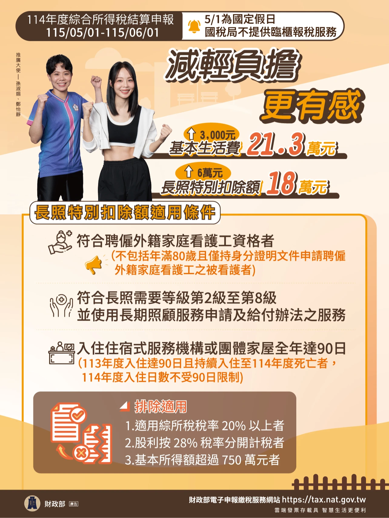 此外,今年放寬人工生殖及生育費扣除額規定,非公家健保醫院,只要經財政部認定會計紀錄完備,醫療費用經中央或地方政府核准補助,可減除政府補助及保險部分,列報支付費用。網紅也別忘了今年要報所得稅。
