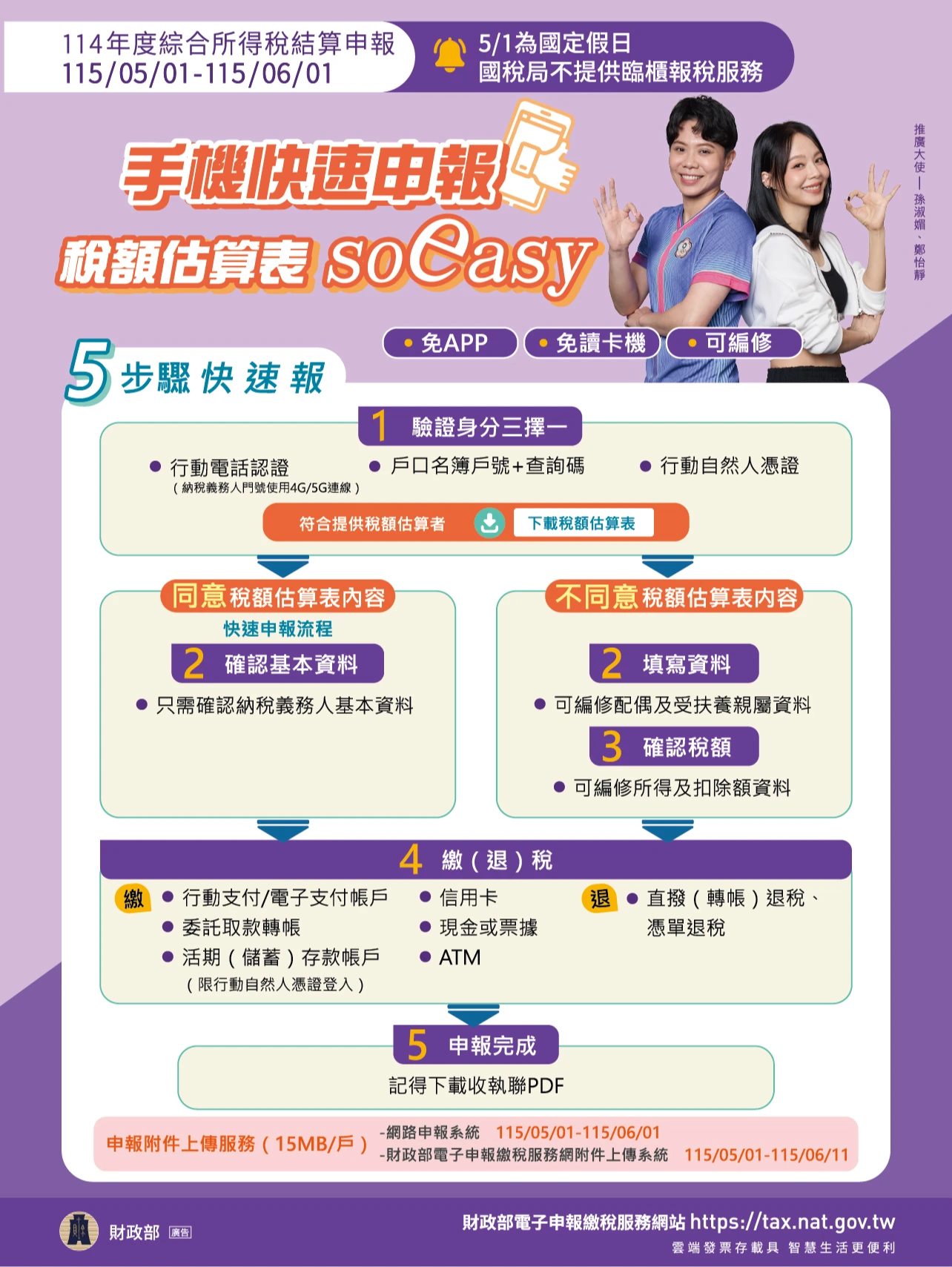 【記者林巧雁/台北報導】財政部賦稅署長宋秀玲今天指出,今年所得稅申報為5月1日至6月1日,5月31日剛好是禮拜天順延一天。她特別提醒今年5月1日為首次全國放假,往常習慣報完稅完成年度大事再出去玩的民眾,5/1當天國稅局不開門,不提供臨櫃服務,想搶頭香的人可自5/1凌晨使用網路報稅。