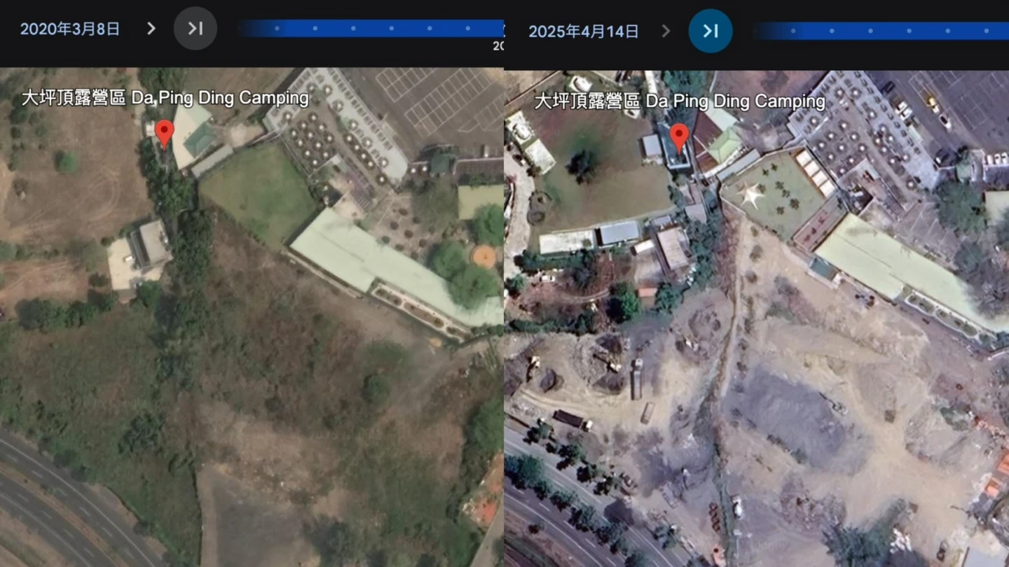 許采蓁說,根據大坪頂保護區的空拍圖,2020年韓國瑜執政時期還有一大片綠地跟茂盛的樹木,5年後的空拍圖內不見樹木,山頭被挖出多處坑洞,場域內還停放多輛卡車,查閱了土地使用分區後,竟發現該處屬於保護區。