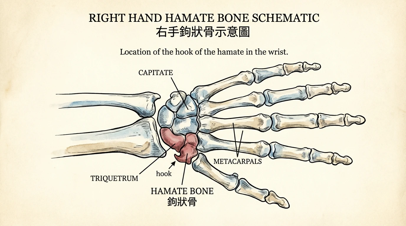 鉤狀骨(Hamate bone)位於手腕小指側,是構成腕骨的八塊骨頭之一。其「鉤狀突起」(Hook of hamate)特別容易在握棒運動(如棒球、高爾夫)中因受力不當而發生骨折,先前中華隊強打張育成在旅美時就曾遭遇鉤狀骨骨折,一般接受手術治療後,恢復期約為4周至6周。