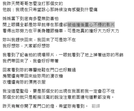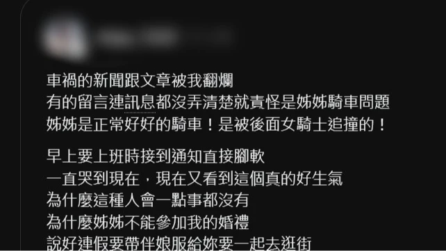 死者警職男友的妹妹也PO文表示,姊姊是正常好好的騎車!是被後面女騎士追撞的!真的好生氣,為什麼這種人會一點事都沒有,「為什麼姊姊不能參加我的婚禮,說好連假要帶伴娘服給妳,要一起去逛街」。