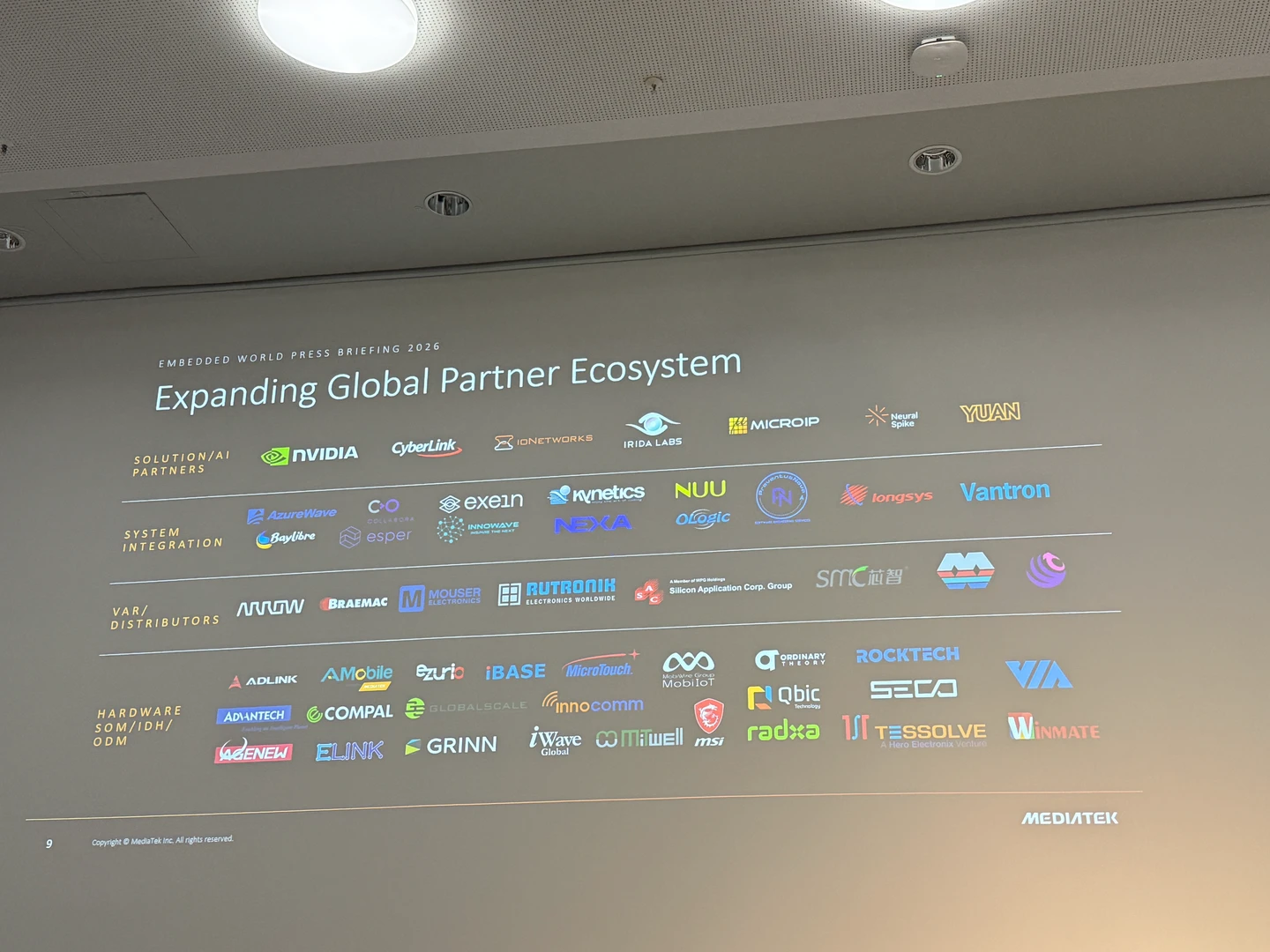 聯發科也公開於Embedded World 2026共同展出GAI/AI及邊緣AI解決方案及嵌入式應用方案的廠商包含AAEON、ADLINK、Advantech、AMobile、Arcadyan、ASUKA、Azurewave、Barco、Beckhoff、Exein、Ezurio、Famoco、FEC、Giga-Ai、Globalscale、Grinn、HTI、Ingenico、InnoComm、ITRI、Lantronix、Mitac、Mitwell、Nuwa、Pegatron、Quectel、Raxda、R-GO、SECO、SERA、Taiwandrone100、Techvision、Teledyne、Vantrontech、VIA、WT Electronics、XC TECH。