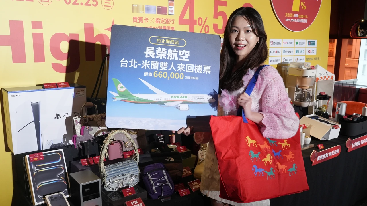 各店大獎包含,台北南西店「長榮航空-台北米蘭皇璽桂冠艙來回雙人機票(價值66萬)」、台中中港店「林曉同交織一克拉鑽戒(價值52萬)」、台北信義新天地「SIMMONS Black Natalie 娜塔莉(182x212 cm,上墊)(價值41萬)」、高雄左營店「OGAWA-AI智能大師椅(普羅旺斯紫)OG-7598X(價值25萬)」等。