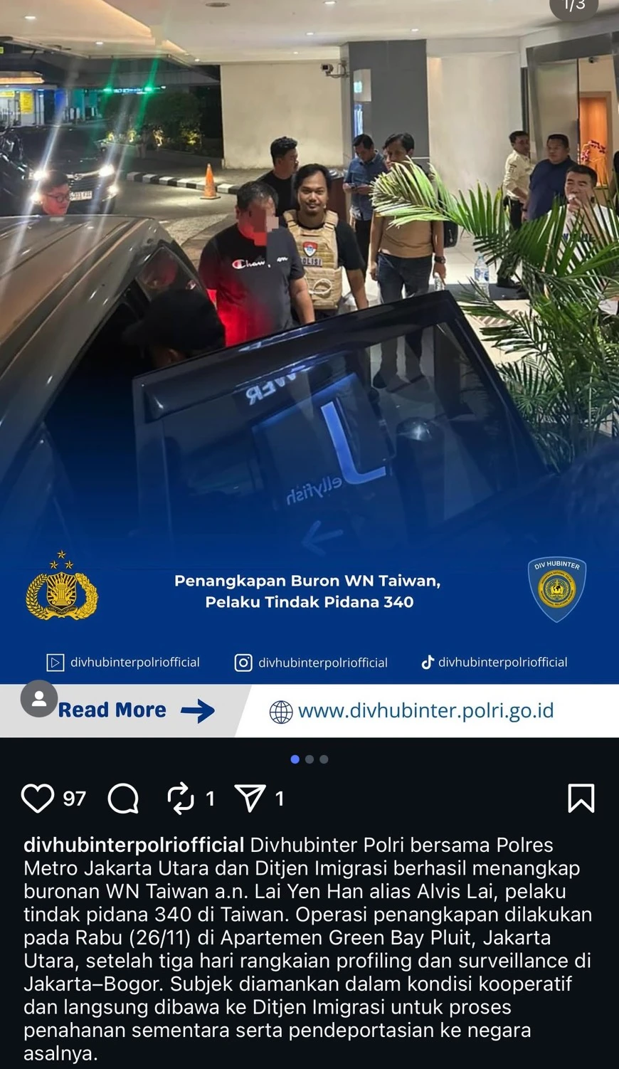 據透露,印尼近年詐騙橫行,印尼警方鎖定持非洲國家護照入境,但照片、姓名疑為亞洲人的對象進行清查。駐印尼台北經貿代表處月前收到印尼警方請求協助,經照片比對,發現Alvis Lai與賴彥翰高度符合,經調閱賴男雙親入出境紀錄,發現兩老曾在2023年及2025年農歷春節搭機前往印尼首都雅加達,疑探視賴男與孫女。