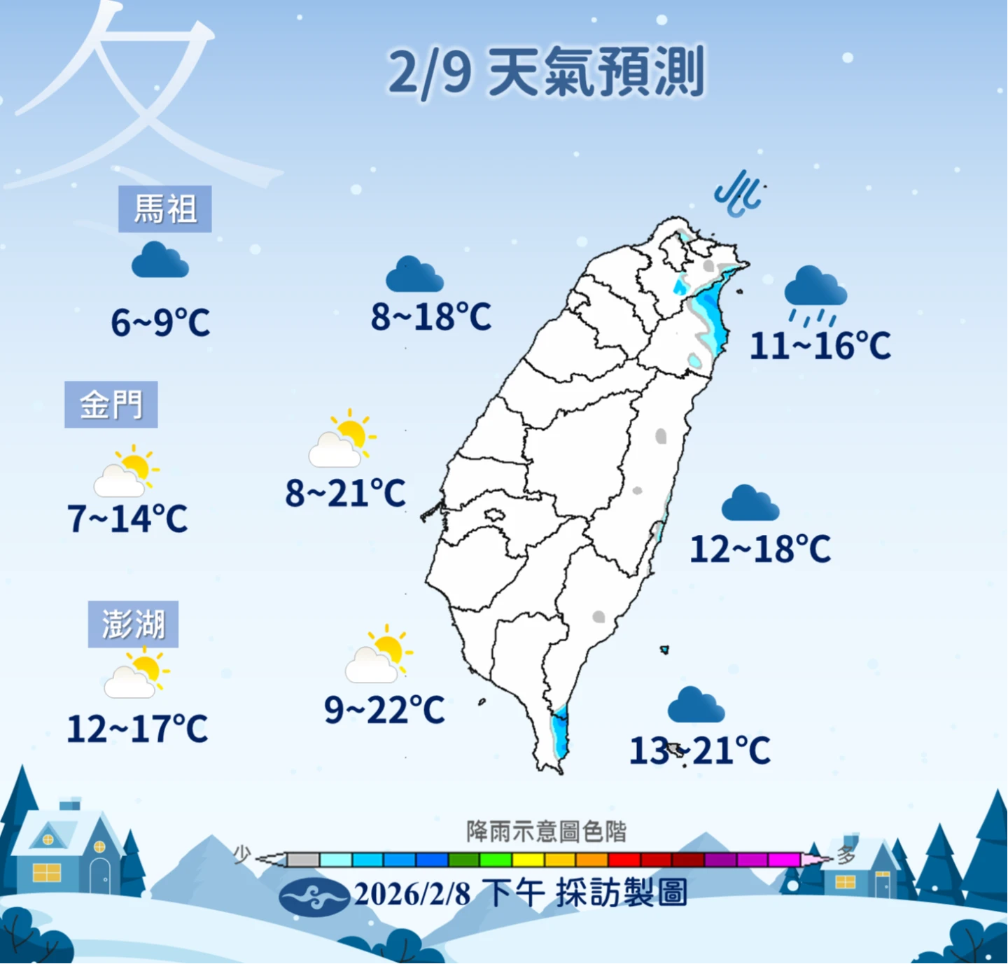 【記者陳亮諭/綜合報導】凍!中央氣象署指出,受寒流影響,今晨(9日)本島平地最低溫為南投縣中寮鄉7.1°C,全台僅澎湖縣未列入低溫特報, 白天起寒流稍減弱,但整體仍偏冷。明天(10日)回暖,周三(11日)因鋒面通過水氣增,周五到小年夜(13日至15日)天氣穩定,中南部高溫可達30°C,除夕至初二(16至18日)東北季風增強,北台灣轉濕涼,各地多雲到晴。