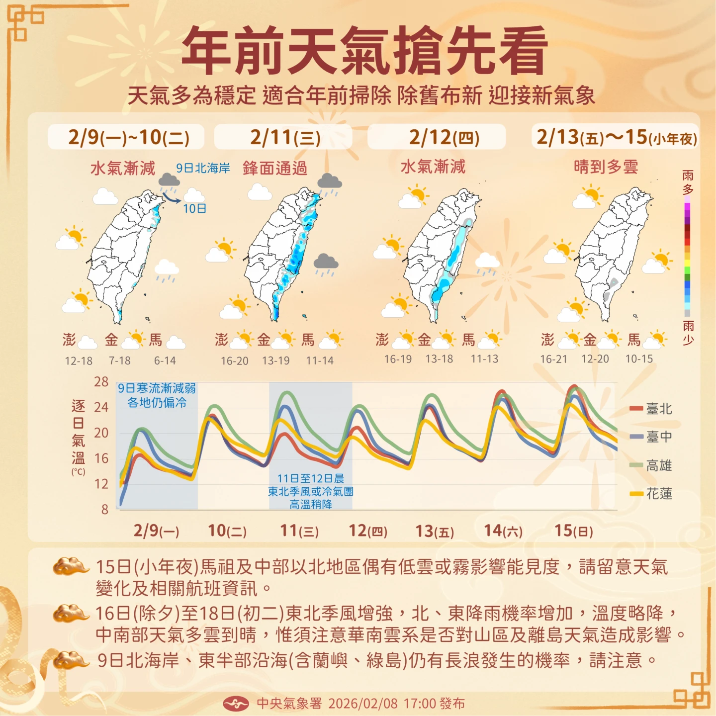 除夕(16日)至初二將再受東北季風增強影響,北台灣氣溫稍下降,北東地區雲多、降雨機率增加,其他地區多雲到晴。