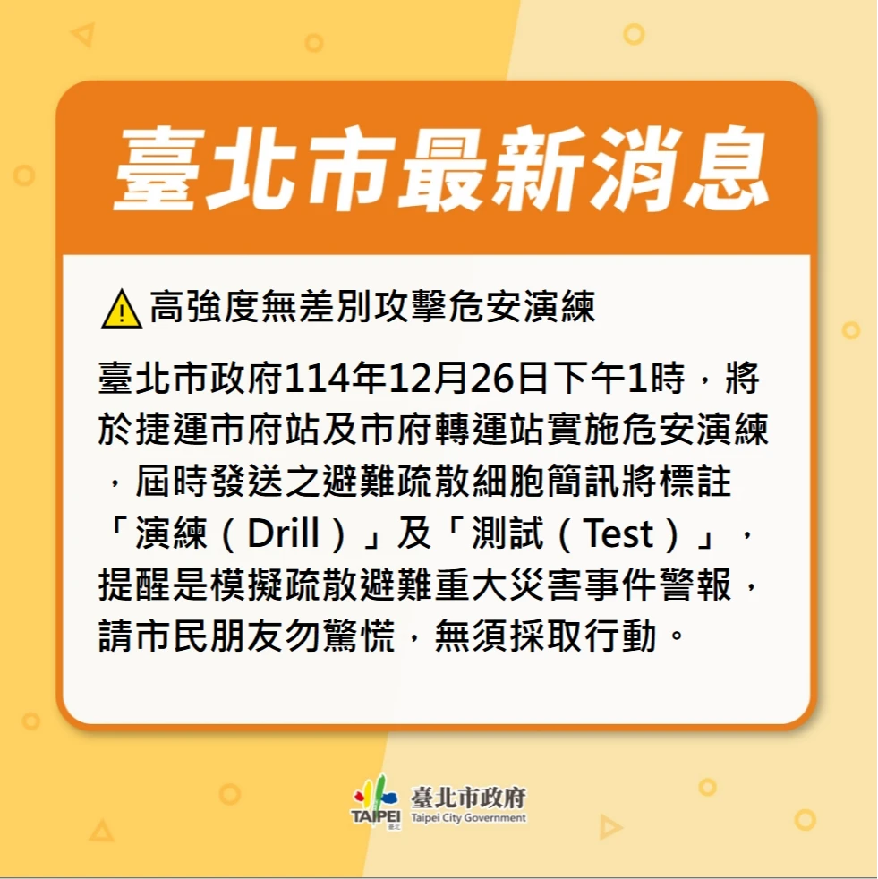 下午1時將發送避難疏散告警細胞簡訊,市府提醒,內容會以中、英文註記為「演練(Drill)」及「測試(Test)」,模擬疏散避難重大災害事件的警報,切勿驚慌。