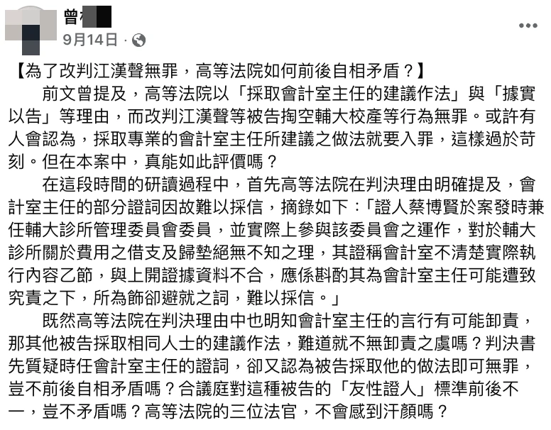 今年9月14日,曾男在臉書發文,以「為了改判江漢聲無罪,高等法院如何前後自相矛盾?」為題,寫下近500字抗議文。