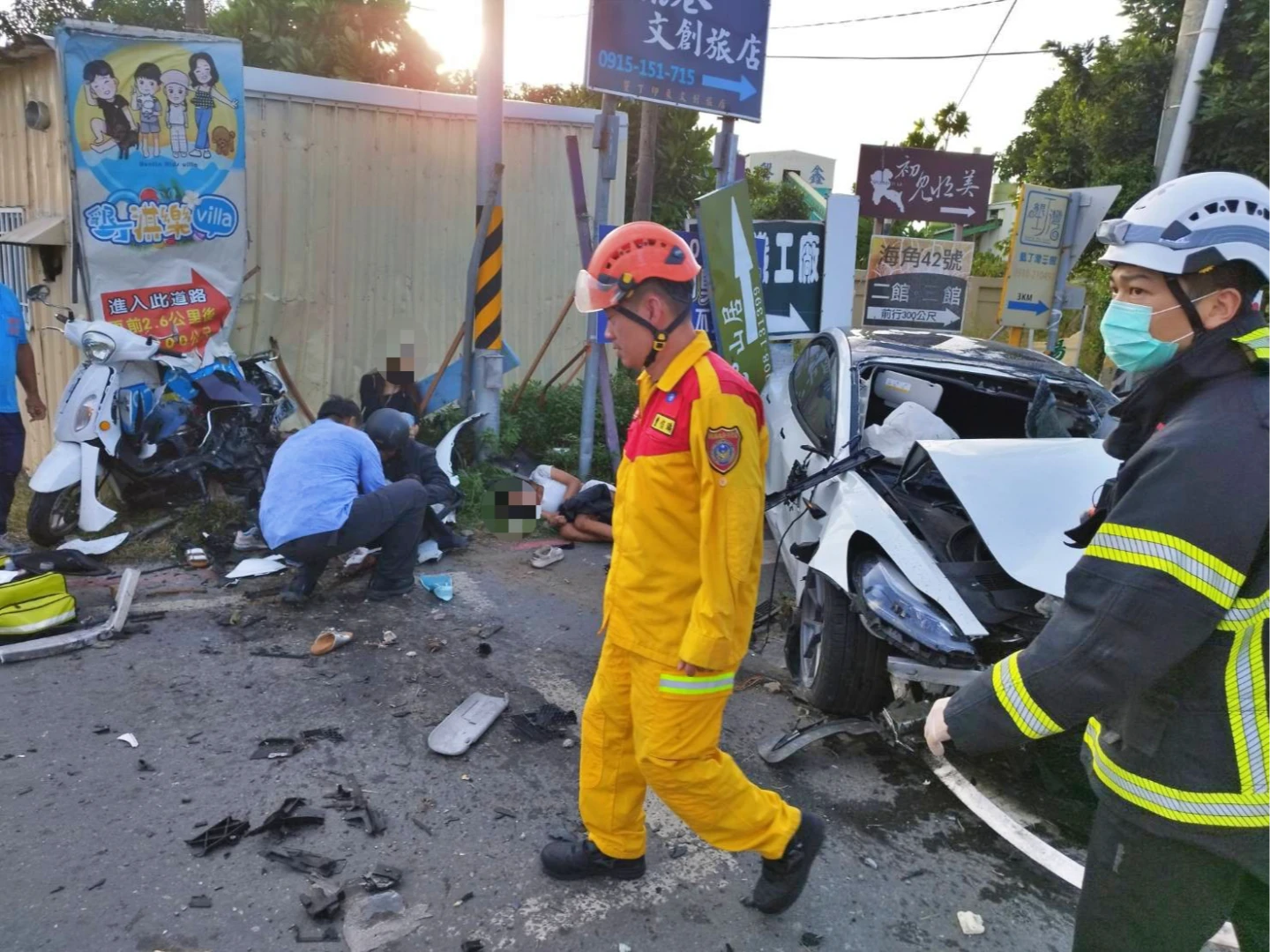 【記者王志弘/屏東報導】屏東縣恆春鎮今天發生一起重大車禍!一輛特斯拉不慎追撞停等紅燈的混凝土預拌車,再失控衝撞另輛2大2小「4貼」機車。現場造成8人送醫,其中特斯拉駕駛失去生命徵象,搶救後宣告不治。案發原因仍待警方釐清。