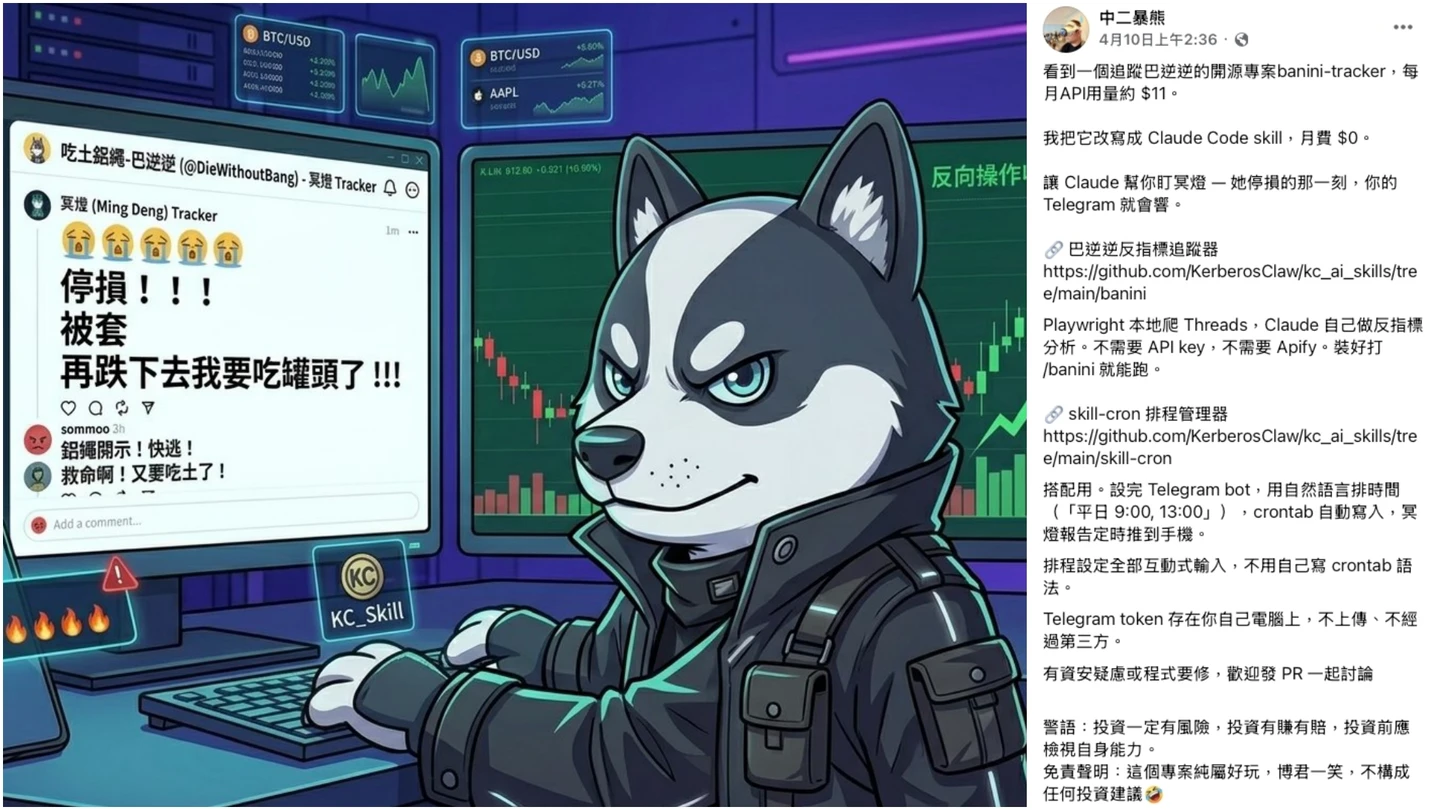 只要她一停損賣出,使用者的Telegram就會收到推播通知,吸引大批網友跟著她「反向開倉」,實測勝率甚至約有60%。面對自己被寫成開源工具的腳本,巴逆逆本尊也在臉書上大方自嘲:「我已經變成工具人了嗎」。