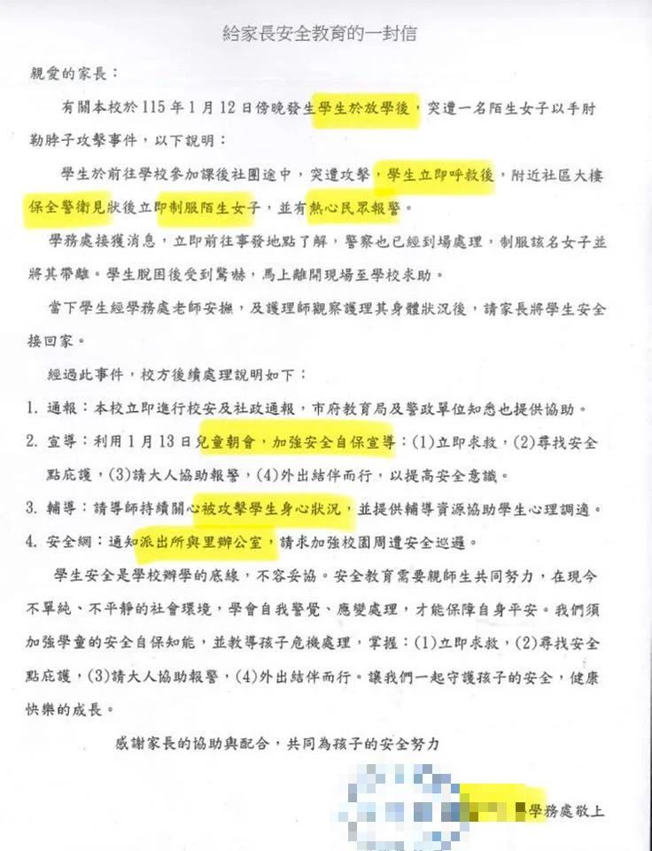 女童就讀學校也發出聲明,指女童參加課後社團途中,突遭攻擊,學生逃回學校後,經學務處老師安撫,及護理師觀察護理其身體狀況後,請家長將學生安全接回家。同時也進行校安及社政通報,利用朝會加强安全自保宣導,也請導師持續關心女童身心狀况,同時也請派出所與里辦公室,加强校園周遭安全巡邏。