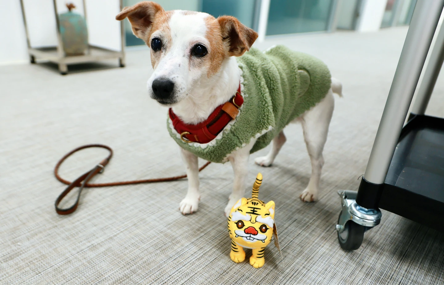陳其邁小年夜特別帶新年禮物「蜜柑萌虎」、「大型超人力霸王提燈」北上,送給蔡英文跟她的毛小孩「可樂(樂樂)」,不過,樂樂對「萌虎」顯得無感,蔡出招將「萌虎」別在樂樂衣服上,虎、犬緊緊相扣。