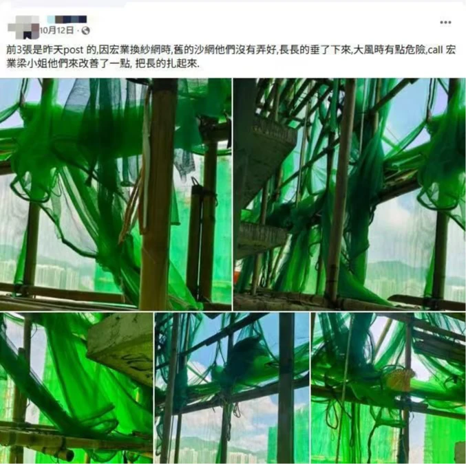 有住戶在社群網站發文表示,鷹架上的網紗在更換時沒有弄好,大風時比較危險。香港大樓安全學會會長何鉅業表示,網紗未有裝好未必會引起火災,但起火大廈的網紗若飄到其他大樓,有可能會波及附近大樓也起火。