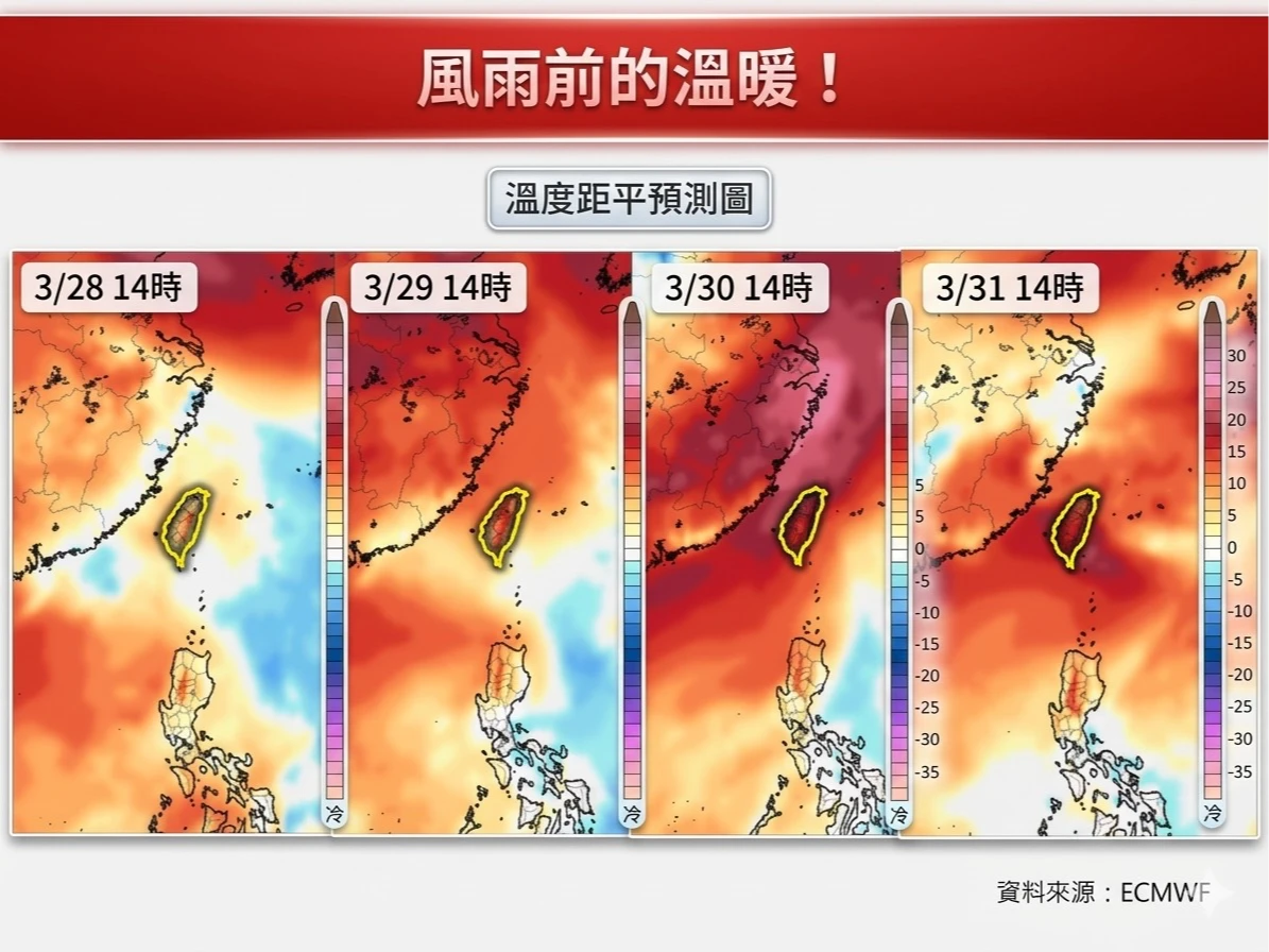 氣象專家吳德榮則在「洩天機教室」專欄撰文指出,周二(31日)起將迎來天氣轉折。受春雨鋒面接近影響,環境水氣增多且大氣不穩定度增大,降雨將分為兩波進行。第一波從周二中午起至晚間,北部及東半部將率先轉為有局部短暫陣雨或雷雨的天氣。第二波則落在周三(1日),雨帶將由北往南移動,依序為各地帶來陣雨或雷雨;同時氣溫也會逐漸下降,北台灣將明顯轉涼。