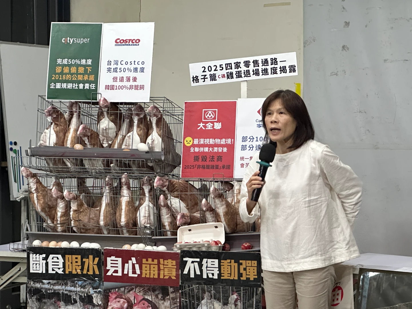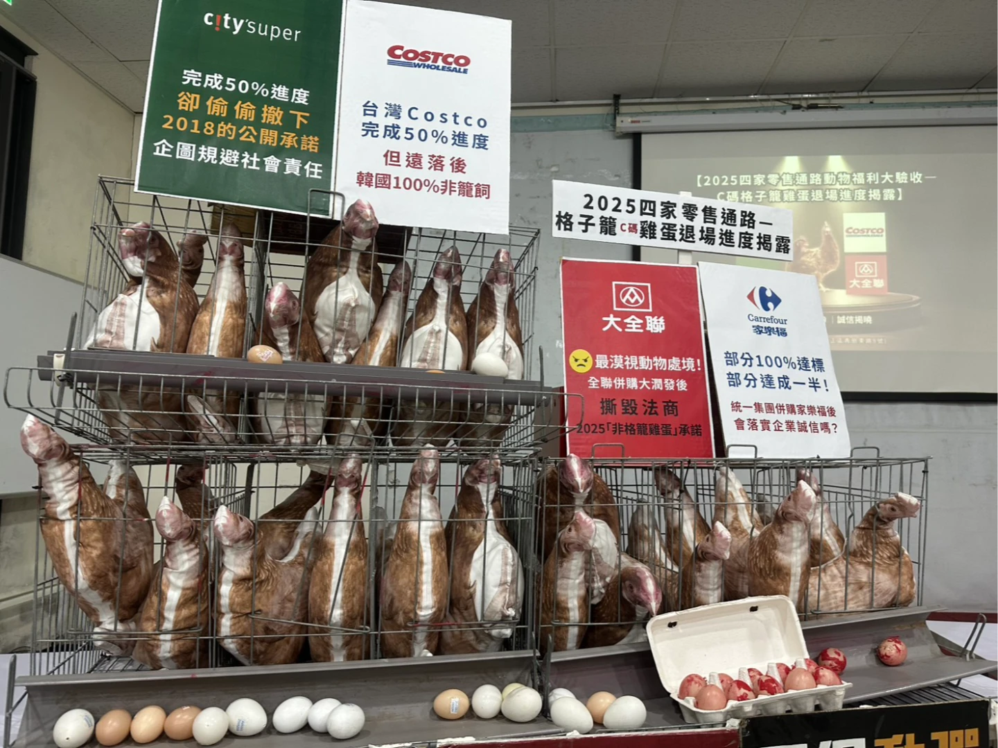 動社今也公布四家企業七家通路現況,台灣家樂福(原法商家樂福,2024被統一集團併購)、大潤發(原法商歐尚集團,2024被全聯集團併購)、City Super(香港公司,台灣由遠東集團投資營運)、好市多(美商Costco)四家企業,亦都有2025「全面販售非籠飼雞蛋」或「停賣格子籠雞蛋」的承諾或目標。