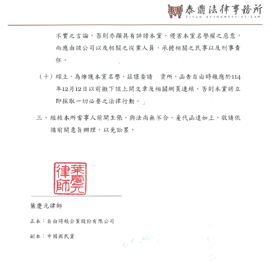 文傳會主委吳宗憲補充,他們昨天已經發出律師函,要求《自由時報》下架文章,這些媒體都是大公司,請他們盡到企業社會責任,做相關報導前做到查證義務,否則這報導錯誤率這麼高,造成社會動盪。