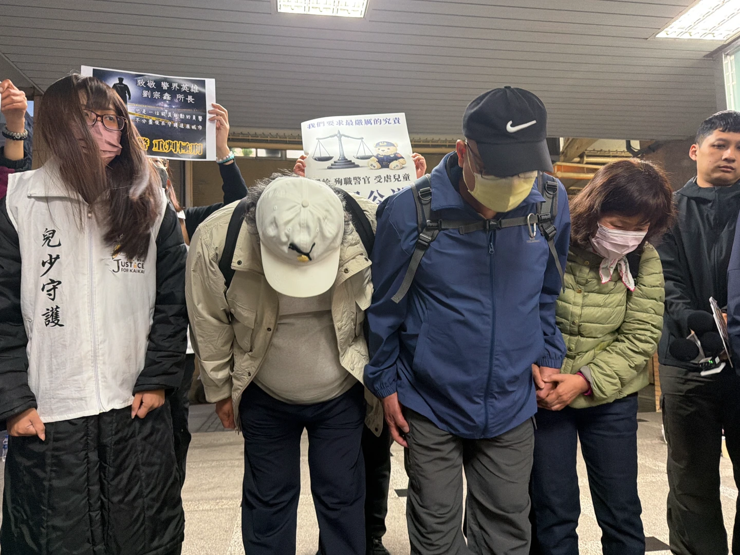 劉爸爸、劉媽媽並和前來聲援的土城警分局長沈明義、剴剴戰士、生命權平等協會理事長林志豪等人在法院外高喊「司法正義伸張!感謝國民法官合議庭!感謝許必奇審判長」!