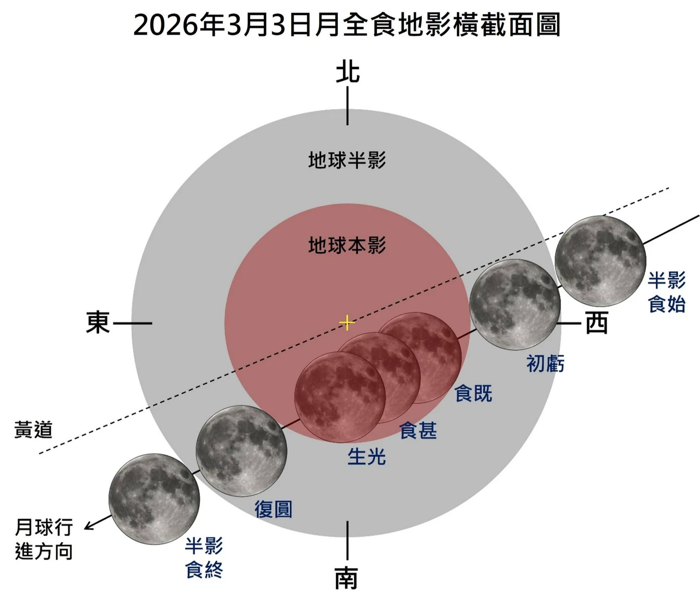 月全食在台灣時間3月3日16時43分起,由「半影食始」揭開序幕、17時50分「初虧」、19時04分「食既」、19時34分「食甚」、20時03分「生光」、21時18分「復圓」,最後在22時25分「半影食終」結束,其間於19時04分至20時03分是最精華的全食階段,計59分鐘。