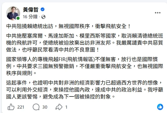 台南市長黃偉哲今天透過在FB、Threads發文指出,國家領導人專機飛越飛航情報區(FIR)係屬國際慣例,通行更是確保國家元首出訪順利的基本原則。此次中共要求第三國無預警撤銷飛航許可,不僅嚴重衝擊飛安,也無視國際秩序與規則。